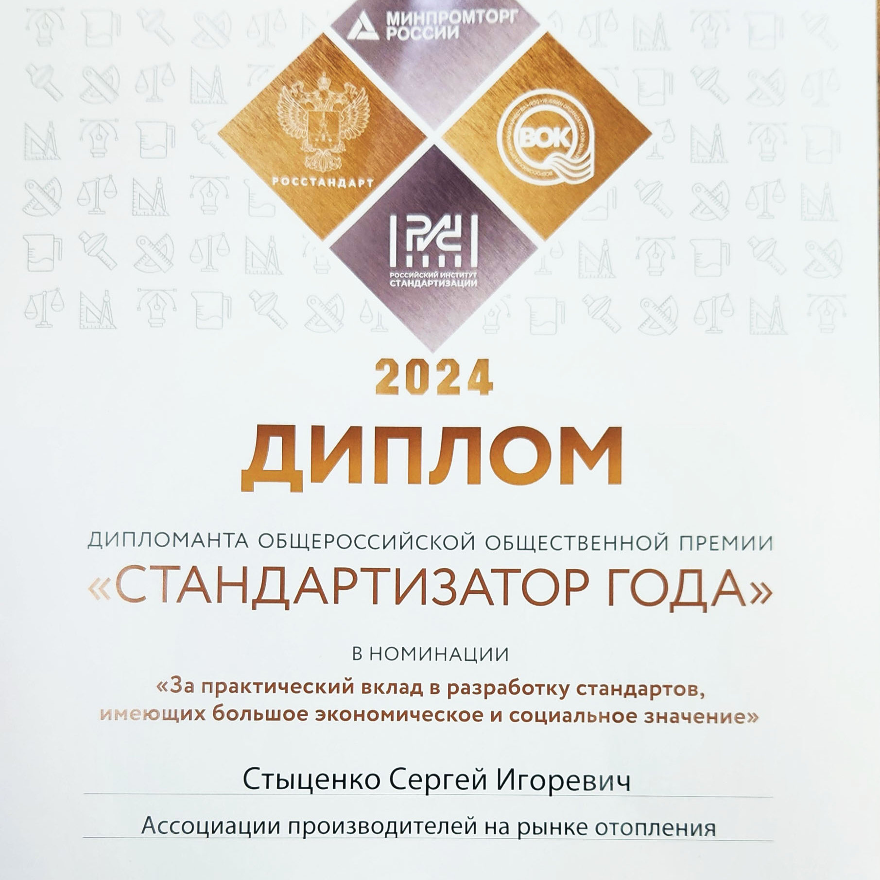 Премия проводится Минпромторгом России, Росстандартом, ФГБУ «Институт стандартизации» и Всероссийской организацией качества и является признанием заслуг высококвалифицированных специалистов по стандартизации перед обществом и государством.